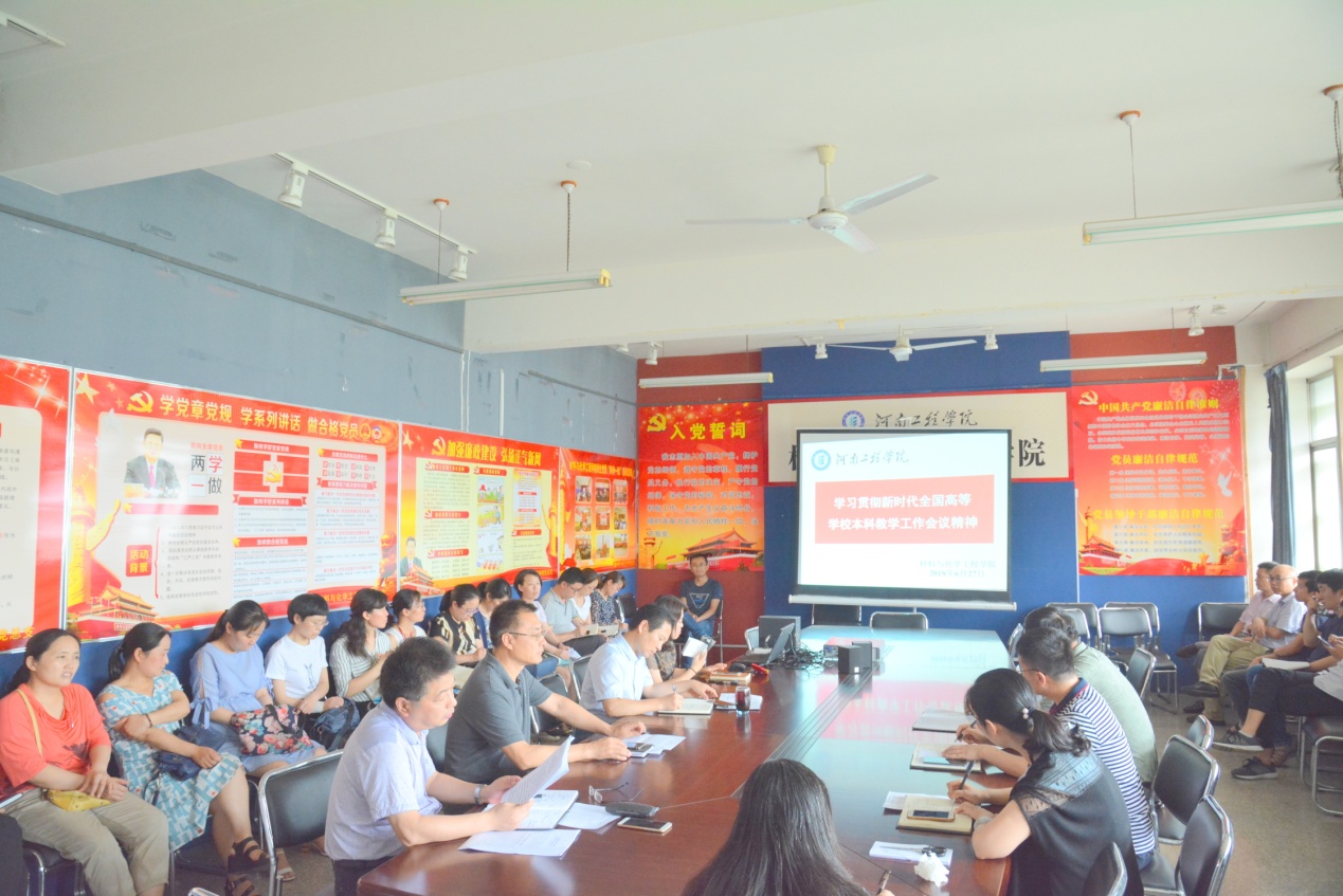 首先,学院全体教职工收听收看了教育部党组书记、部长陈宝生在四川成都召开新时代全国高等学校本科教育工作会议上的讲话。陈宝生指出,高教大计、本科为本,本科不牢、地动山摇。人才培养是大学的本质职能,本科教育是大学的根和本,在高等教育中是具有战略地位的教育、是纲举目张的教育。高校领导注意力要首先在本科聚焦,教师精力要首先在本科集中,学校资源要首先在本科配置,教学条件要首先在本科使用,教学方法和激励机制要首先在本科创新,核心竞争力和教学质量要首先在本科显现,发展战略和办学理念要首先在本科实践,核心价值体系要首先在本科确立。陈宝生强调,要推进“四个回归”,把人才培养的质量和效果作为检验一切工作的根本标准。一是回归常识。要围绕学生刻苦读书来办教育,引导学生求真学问、练真本领。二是回归本分。要引导教师热爱教学、倾心教学、研究教学,潜心教书育人。三是回归初心。要坚持正确政治方向,促进专业知识教育与思想政治教育相结合,用知识体系教、价值体系育、创新体系做,倾心培养建设者和接班人。四是回归梦想。要推动办学理念创新、组织创新、管理创新和制度创新,倾力实现教育报国、教育强国梦。